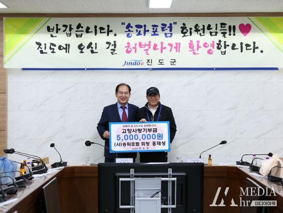 미디어아워 임다연 기자 | (사)송파포럼 홍재성 회장이 송파포럼 진도군 홍보여행(팸투어)과 함께 고향사랑 기부금 500만원을 기탁했다.