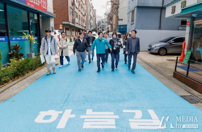 마포구는 지난해 9월부터 합정역 7번 출구에서 마포새빛문화숲까지 이어지는 일대를 하늘색 도로가 이색적인 ‘하늘길’로 조성했다.