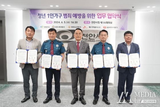 천안시는 지난 5일 시청 제1소회의실에서 천안서북·동남경찰서, 에스케이쉴더스(주), 웅진보안시스템(주)와 ‘청년 1인가구 범죄 예방을 위한 업무 협약’을 체결했다.