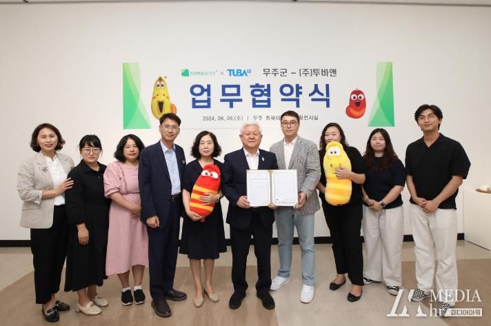 26일 최북미술관 기획전시실에서 열린 업무협약식에는 황인홍 무주군수와 ㈜투바앤 임기택 사업 이사 등 양측 관계자 10여 명이 참석했으며 양측은 전시 교육프로그램 등 주요 사업 진행을 위한 상호협력과 콘텐츠 협업을 약속했다.