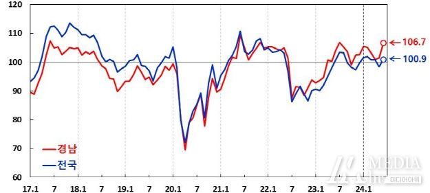 (소비자심리) 26일 한국은행 경남본부가 발표한 2024년 5월 경남지역 소비자 동향조사 결과에 따르면 5월 경남지역 소비자심리지수(CCSI)는 106.7로 전월(101.4)보다 큰 폭(5.3p)으로 상승했다.