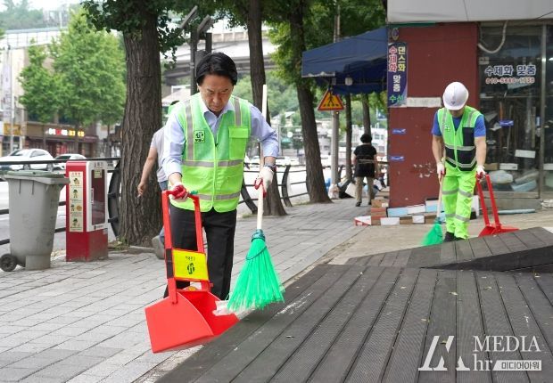 미디어아워 임다연 기자 | 이성헌 서대문구청장이 민선 8기 후반기 첫날인 1일 새벽 관내 인왕시장길을 찾아 거리 청소를 하고 있다. 이 구청장은 2년 전이었던 민선 8기 첫날 새벽 첫 일정으로도 같은 곳에서 청소 작업을 펼친 바 있다.