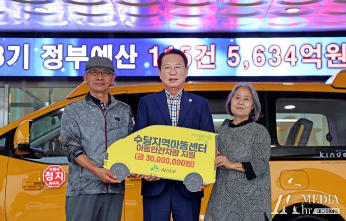 미디어아워 임다연 기자 | 괴산군은 2일 군청에서 아동안전차량 구입비 지원 전달식을 열고, 수달지역아동센터에 3천만 원을 전달했다.