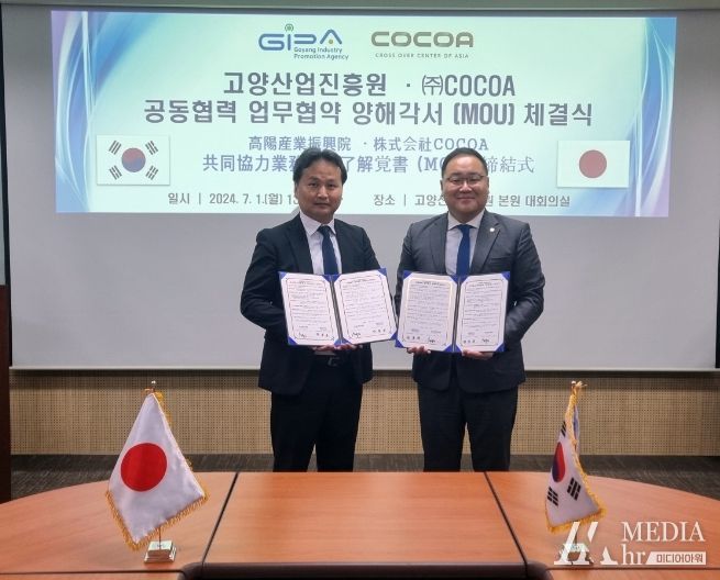 미디어아워 임다연 기자 | 고양특례시 산하 고양산업진흥원은 지난 1일 오후, 일본 도쿄 소재 한상(韓商)기업인 ㈜COCOA와 한일 기업 간 교류 촉진 등을 위한 업무협력 양해각서(MOU)를 체결했다.