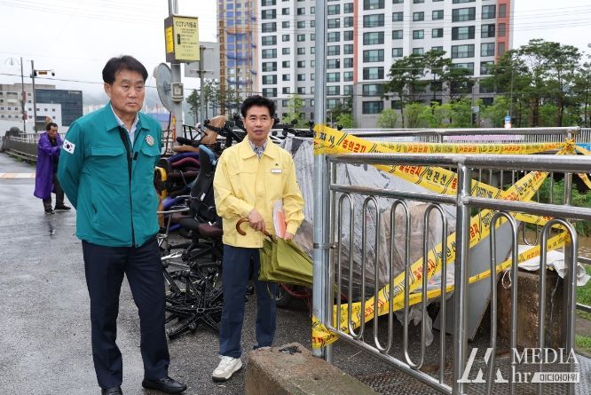 미디어아워 임다연 기자 | 하은호 군포시장은 지난 7월 2일 집중호우시 침수가 우려되는 산본1동 주택가, 당동지하차도, 안양천 하천변 도로 등에 대해 현장점검을 실시했다.
