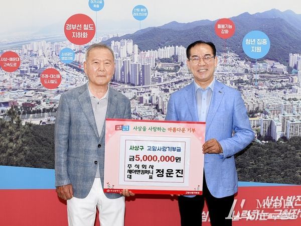 미디어아워 임다연 기자 | 부산 사상구는 지난달 21일 ㈜제이앤컴퍼니 정운진 대표가 고향사랑기부금 500만원을 기부했다고 밝혔다.
