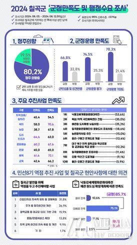 미디어아워 임다연 기자 | 칠곡군청은 여론조사 전문기관 ㈜리서치민에 의뢰하여 지난 6월 3일부터 6월 12일까지(10일간) 만 18세 이상 칠곡군민 1,015명을 대상으로 1:1 개별면접 방식을 통해 2024 칠곡군 군정만족도 및 행정수요조사를 실시했다.