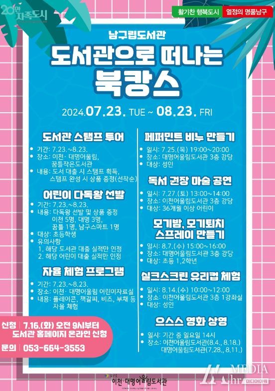 미디어아워 임다연 기자 | 대구 남구는 7월 23일부터 8월 23일까지 약 한 달간 남구립도서관에서 주민들의 무더위를 식힐 '도서관으로 떠나는 북캉스'행사를 운영한다고 밝혔다.