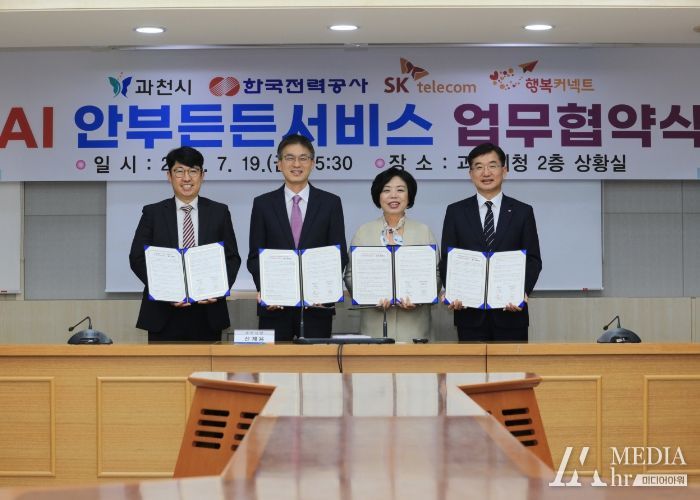 미디어아워 임다연 기자 | 과천시가 고독사 예방을 위해 사회적 고립 가구의 안부를 24시간 확인하는 ‘AI 안부든든 서비스’의 시범 도입을 추진하는 가운데, 19일 시청 상황실에서 한국전력공사 남서울본부, SK텔레콤, 재단법인 행복커넥트 와 업무협약을 체결했다.