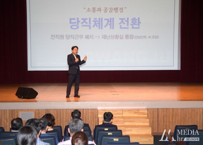 강 시장은 “취임 이후 비효율적 당직근무의 개선을 고민했다. 담당부서 등은 행안부 지침 때문에 어렵다고 했지만, 직원들과 소통 과정에서 새로운 방안을 도출했다”며 “오랜시간 시행됐던 당직제를 재난상황실로 통합하고, 전담인력과 인공지능(AI)이 대신 할 수 있도록 하는 것, 이것이 행정의 변화”라고 말했다.